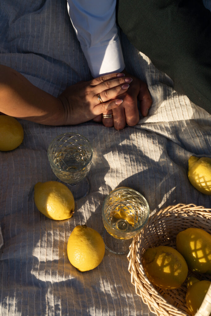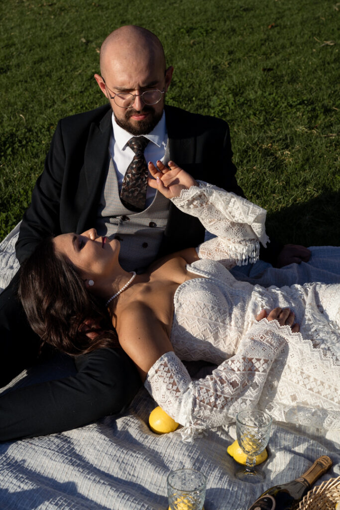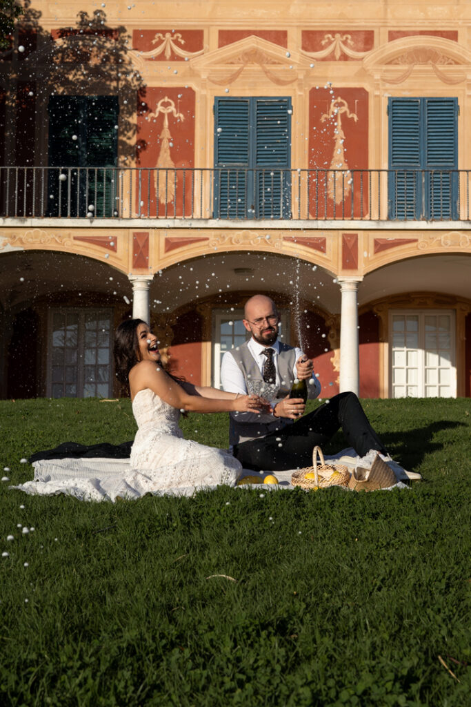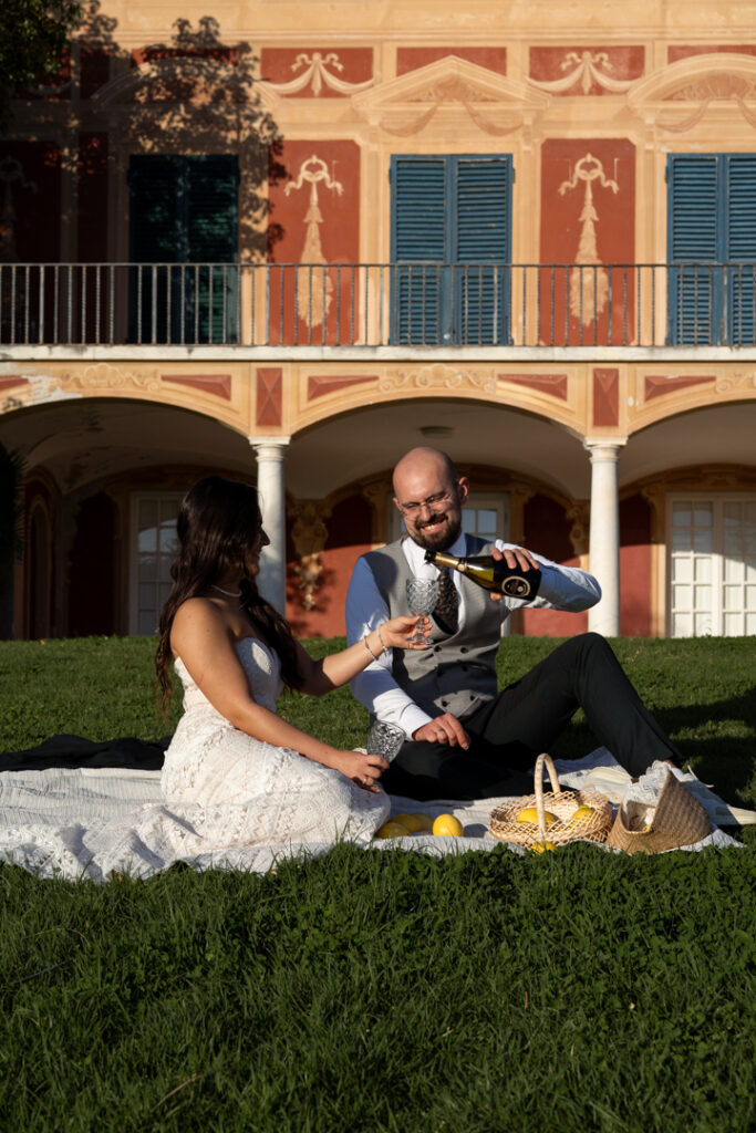 We started in the green gardens of Parchi di Nervi, surrounded by late summer light. Sandra had a dream — a photo on the staircase of Villa Grimaldi Fassio. We took our time there, letting the place shape the mood. In front of the villa, they shared a small picnic. Lemons, laughter, and the simple joy of opening a bottle of champagne together. No timeline, no expectations.